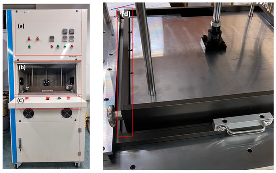 Laboratory-scale hot-press equipment. (a) Process indicators, (b) hot-press zone, (c) control panel, (d) hot-press sidewalls.