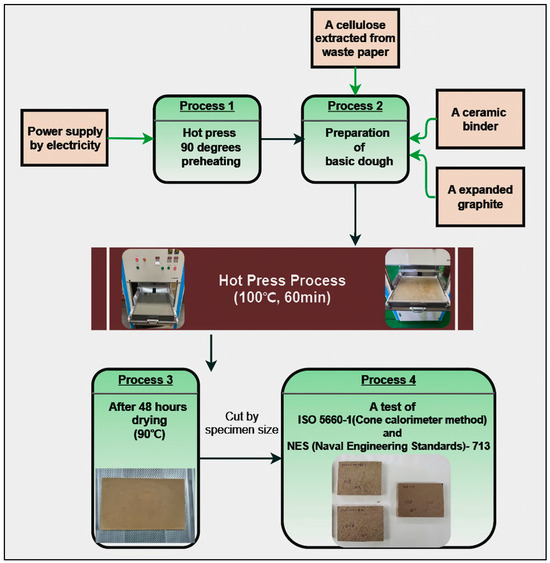 Finally, once the process was complete, the top plate was pneumatically lifted upward. The bottom plate was then positioned in front of the researcher to remove the sidewalls, and the plate-like specimen was transferred to a drying plate for post-process drying. The plate was then placed in a dryer to dry at a temperature of 90 °C for 48 h. Figure 2 shows a process flow chart of the hot-pressing process. The plate-like flame-retardant board was cut at three random points to meet the specifications of the test specimens for ISO-5660-1 and NES-713 tests.