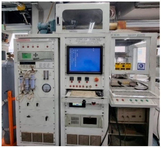 Cone calorimeter testers are often used in small-scale experiments to test the fire behavior of building materials. Figure 3 shows the cone calorimeter tester used in this experiment. The International Organization for Standardization has adopted the cone calorimeter tester as a standard for measuring the Heat Release Rate (HRR) of the test materials. The standard is specified in ISO-5660-1. Huggett, C., confirmed that the heat released from building materials is proportional to the oxygen consumed during combustion. He also confirmed that most fuels produce about 13.1 MJ of energy per kilogram of oxygen, based on experiments with different types of test materials [18]. Based on these results, the amount of oxygen consumed is measured to collect data such as those for HRR and THR, which are important parameters in fire experiments and fire risk assessment.