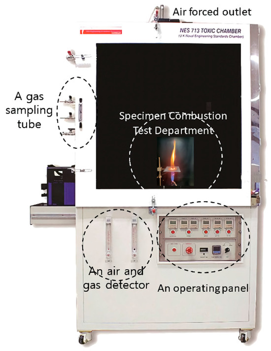 The test is performed using the apparatus shown in Figure 4. The NES 713 tester consists of a chamber, control panel, and sampling tube. The chamber contains a specimen support, a Bunsen burner to control the flame, a mixing fan to equalize the gas atmosphere in the chamber after combustion, a gas sampling ring tube, and a forced air extraction for internal ventilation after the end of the test. Each sample was cut to 1 ± 0.2 g and stored in a constant temperature and humidity chamber at 23 ± 1 °C and 50 ± 5% relative humidity for 24 h before testing. The prepared specimens were subjected to complete combustion for 2 min in a 100–120 mm high flame at a temperature of 1150 ± 25 °C by adjusting the ratio of oxygen and methane gas. After combustion, the mixing fan was operated and the gas was detected through the gas-detection tube using a gas detector.