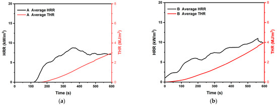 Figure 5 shows the results of the 10 min THR of the flat-board specimens. The average THR value of specimen A was the lowest at 2.9 MJ. The average THR value of each specimen was 3.9 MJ for specimen B, 5.8 MJ for specimen C, and 4.2 MJ for specimen D. In addition, all four specimens containing additives were not found to have a THR value of more than 8 MJ when tested for 10 min, which is the safety standard used in Republic of Korea and Japan.