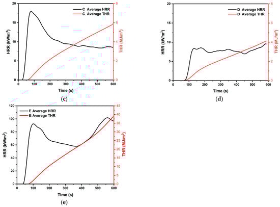 Specimen for ISO 5660-1 test THR and HRR. (a) Result for ISO 5660-1 Test piece A; (b) Result for ISO 5660-1 Test piece B; (c) Result for ISO 5660-1 Test piece C; (d) Result for ISO 5660-1 Test piece D; (e) Result for ISO 5660-1 Test piece E.