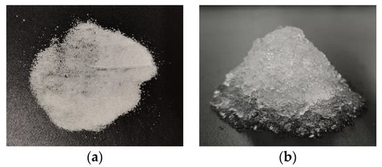 Polyacrylate-sodium SAP from Shandong Huadi Co., Ltd. in Shandong Province of China was used as internal curing agent in this study, which included two particle sizes of 100–120 mesh (SAP-100) and 150–200 mesh (SAP-200). The macroscopic appearance and morphology of SAPs before and after absorbing water are presented in Figure 1 and Figure 2, respectively. The main technical indicators and the measured liquid absorption in fresh cement paste with a W/C (water–cement ratio) of 0.4 at 30 min of SAP are illustrated in Table 1.