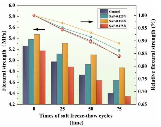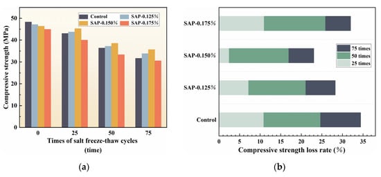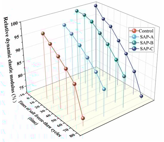 As is described in Figure 9, the curve of the SAP-concrete moved up significantly and the porosity enlarged with the increase of SAP dosage, compared with the control group. The increase in porosity might be detrimental to the strength of the concrete, as reflected in the fact that the compressive strength of the SAP-concrete was lower than that of the control group at the end of the curing age. Combined with the value of the total surface area illustrated in Table 7, it was suggested that the degree of SAP-0.175% increased the most, followed by SAP-0.150% as well as SAP-0.125%. The larger the total pore area is, the greater the number of residual pores left by SAP gels, which confirms that more buffer space could be provided in SAP-0.150% than SAP-0.125% during the progress of frost. Nevertheless, porosity does not always have a positive impact for the resistance of salt freeze–thaw cycles of concrete. It has been found in the correlative study that with the increase of freeze–thaw cycles, the small pores inside the concrete might be transformed into large pores, and in this case, the proportion of harmless pores decreased and the proportion of multi-hazard pores increased [37]. That is why SAP-0.175% displayed a poor performance in the macroscopic test.