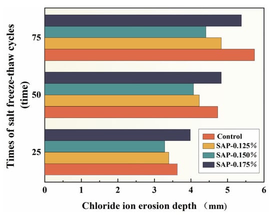 - The reduction in mass loss rate and relative dynamic elastic modulus were improved and the resistance to chloride ion erosion was enhanced by SAP internal curing. After 75 cycles, the mass loss rate and the relative dynamic elastic modulus of SAP-0.150% were 65.76% and 1.12 times of the control group, respectively. Furthermore, the chloride ion erosion depth of SAP-0.150% was 23.18% lower than the control group.