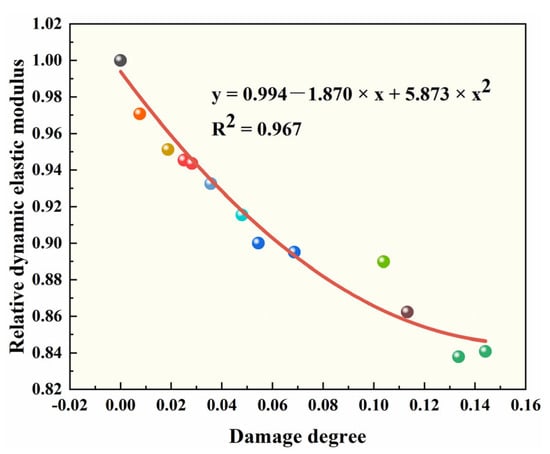 In the process of salt freeze–thaw cycles, the external damage of cement concrete was characterized by mass loss, which was caused by the spalling of specimen surface, and its development of internal microcracks could be reflected by the dynamic elastic modulus. Therefore, the mass loss rate and relative dynamic elastic modulus calculated via Equation (2) and Equation (3) were adopted to evaluate the external and internal damage degree of cement concrete after salt freeze–thaw cycles.