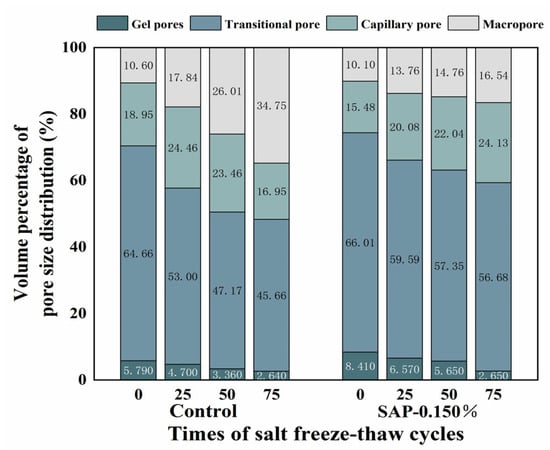 To find the influence of SAP internal curing on the pores inside cement concrete during salt freeze–thaw process, the control group and SAP-0.150% (the optimal group in macroscopic performance) were selected. The cumulative pore volume percentages are shown in Figure 10, which are classified according to the principles of gel pores (<10 nm), transitional pores (10–100 nm), capillary pores (100–1000 nm) and macro pores (>1000 nm).