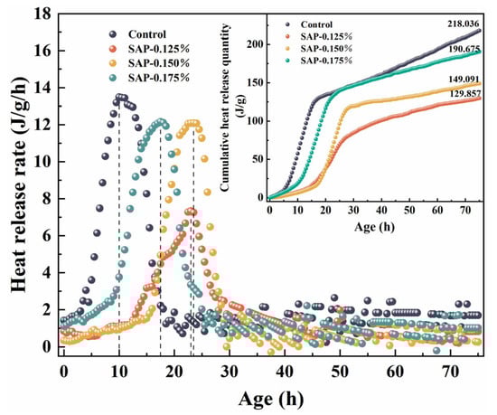 The variation curves of the hydration heat release rate and the cumulative heat release quantity of mortars with SAPs of different dosage are presented in Figure 11.
