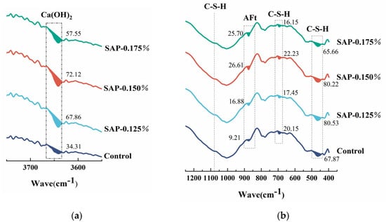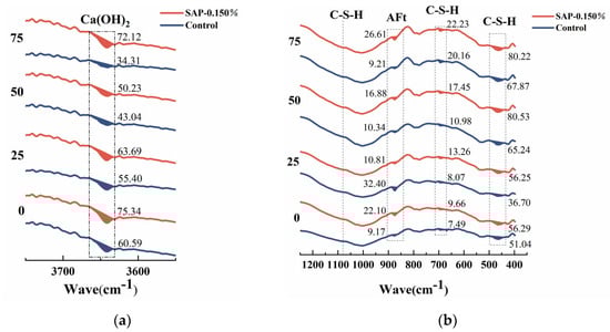 FTIR spectrum of pavement concrete with different SAP dosage after 75 cycles: (a) the peak area of Ca(OH)2; (b) the peak area of C-S-H and AFt.