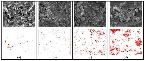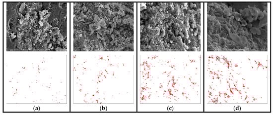 It can also be recognized from Table 8 that with the increase of cycles, the count of pores and porosity increased obviously. Particularly, the porosity of the control group increased by 1.659% during the cycle times of 50 to 75. That is why the performance damage of the control group exacerbated in the progress of the last 25 cycles. Suffering 75 cycles, the overall structure was incompact with the dense pores on the matrix in the control group (see Figure 14d). Furthermore, the count of pores, total area and porosity of the control group reached 3152 pixel ², 17,434 pixel ² and 2.715%.