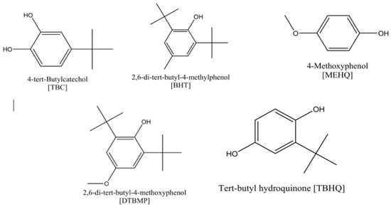 Various techniques have been introduced to control the runaway reactions: venting, containment, venting with containment, and reaction inhibition. Out of these techniques, reaction inhibition is a poorly investigated field since runaway laboratory experiments are regarded as highly dangerous []. The reaction inhibition technique involves injecting small quantities of a particular chemical substance (inhibitors) into the reactor at the beginning of runaway. The chemical substance employed can entirely suppress the chemical reaction (acting as an inhibitor) or retard the reaction rate to manage time for an emergency response []. Additionally, due to the spontaneous formation of undesired polymer or fouling from organic peroxides by auto-advancement of polymerization, the rate of the heat transfer drastically decreases and the time required for cleaning purposes increases [,], which makes the handling process less efficient. Thus, the control of undesired polymerization of monomers is a challenging issue faced by industries, and hence inhibitors are necessary to stabilize the monomers during distillation, storage, and transportation processes.