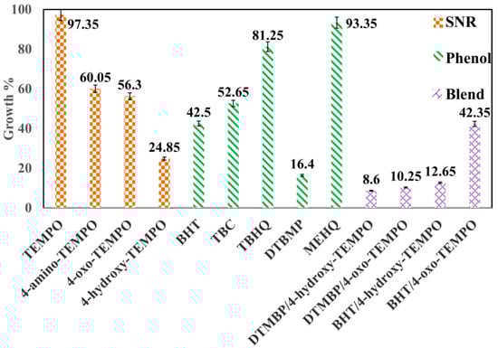 Darvishi et al. also studied the synergistic effect of SNRs (TEMPO and its analogues) and phenolics to examine the inhibition performance []. They injected a blend of SNRs and phenolics (50 wt.%) in the process with 50 ppm overall concentration. Figure 9 shows the comparison of the growth percentage of various single inhibitors and their blends. It can be inferred from the figure that DTBMP/4-hydroxy-TEMPO exhibits the best inhibition performance, while single component TEMPO exhibits the poorest performance. The synergistic effect of the blends of SNRs and phenolics depends strongly on the hydrogen atom donation and acceptance capabilities of phenolics and SNRs, respectively. By employing the blends of SNRs and phenolics, these capabilities are greatly enhanced, thereby improving the inhibition performance of the blends.