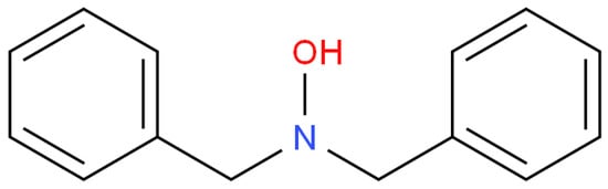 N,N-Dibenzyl hydroxylamine, also known as DBHA, acts as an inhibitor for styrene polymerization [,]. It is less toxic in nature. The structure of its molecule is shown in Figure 10. Since the RNO–H bond present in the molecule is comparatively weak, this inhibitor can check the propagation of polymerization by hydrogen abstraction. By the homolytic dissociation of the O–H bond of the hydroxylamine, nitroxides (RNO∙) and alkanes (RH) subsequently form, which cannot further propagate the polymerization.