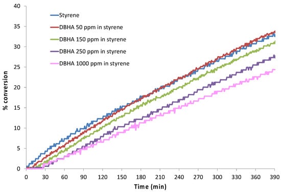 Plots of percentage conversion during the auto-initiated styrene polymerization in the presence of DBHA inhibitor [].