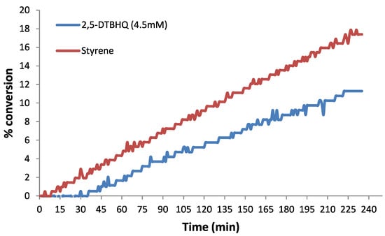 Figure 15 shows the dilatometry trace of 4.5 mM solution of 2,5-DTBHQ in styrene being analyzed at 110 °C for 4 h to inhibit the thermal styrene polymerization. It is evident from the figure that the inhibition time of styrene polymerization by 2,5-DTBHQ is 36 min, which is in fact worse taking into account the high concentration of the inhibitor. It can be assumed that 2,5-DTBHQ ceases to work in the absence of oxygen and the inhibition time is basically the time taken by the reaction system to become deoxygenated. Thus, the dilatometry trace concludes that 2,5-DTBHQ exhibits an inhibition property only in the oxygenated environment and its efficacy owes to the termination of the propagation chains via hydrogen abstraction. The inhibition phase is then followed by a duration of a little retardation of the styrene polymerization by 2,5-DTBHQ, which can be inferred from Figure 14 in which the slope of the dilatometry trace is smaller as compared to that of polymerization in the absence of the 2,5-DTBHQ inhibitor. More specifically, the formed 2,5-DTBBQ may react with the carbon-centered radicals via the addition reaction and terminate some propagating chains [].