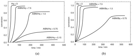 Figure 16a displays the conversion profiles with respect to time for the DSC experiments in the presence of the Hq inhibitor and radical initiator azoisobutyronitrile (AIBN). It can be inferred from the plots that the introduction of the Hq inhibitor results in an inhibition period, the length of which depends on the Hq concentration. Hq acts as an inhibitor since it consumes the free radicals produced by the initiator. In the case of an AIBN/Hq ratio greater than 1 and after the inhibition period, the conversion profile has the same trend as that of the reaction in the absence of the inhibitor. Similarly, the conversion profiles for DSC experiments performed in the presence of the Bq inhibitor is shown in Figure 16b. The experiments do not show any inhibition period and the reaction progresses comparatively slowly reach a low final conversion. Additionally, BQ acts as a retarder since it partially neutralizes the radicals primarily targeting the active centers of the polymer chains.
