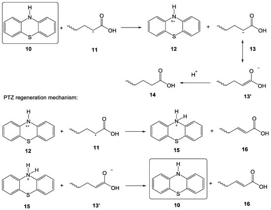 Another important inhibitor is PTZ which is a highly efficient, commercially employed liquid-phase inhibitor that can work in both oxygenated and oxygen-less environments []. PTZ works as an amine-radical trap in an aprotic nonpolar solution and possesses an efficacy of two radical neutralization per PTZ molecule []. However, in an acrylic acid medium, PTZ acts via a catalytic mechanism. Levy et al. studied the inhibition mechanism of PTZ [], as shown in Figure 21 []. The efficiency of PTZ (10) is independent of oxygen level, since it rapidly reacts with propagating chains as compared to oxygen []. The inhibition mechanism of AA polymerization by PTZ is as follows: (a) PTZ becomes oxidized to a radical cation (12); (b) the carbon-centered radical (11) transforms to carbanion (13); (c) (13) is further neutralized to 14; (d) radical cation (12) scavenges a hydrogen atom from (11) resulting in the formation of acrylic acid derivative (16) and protonated PTZ (15); and (e) the anionic intermediate (13′) combines with (15) to make it lose proton with the regeneration of PTZ. It is noteworthy that due to the regeneration of PTZ during the inhibition of the polymerization reaction, the inhibition capacity of PTZ lasts for a long time.