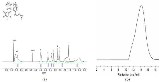 Solutions of: (a) VBGE (0.006 mol, 1.14 g), PFMA (0.018 mol, 4.5 g), and AIBN (4 × 10−5 mol, 0.2 mL) in 6 mL DMF and (b) VBGE (0.012 mol, 2.28 g), PFMA (0.012 mol, 3.0 g) and AIBN (4 × 10−5 mol, 0.2 mL) in 6 mL DMF, were prepared in Schlenk tubes to obtain the [PFMA]/[ VBGE] ratios of 3:1 and 1:1, respectively. The solutions were degassed using five freeze-pump-thaw cycles to remove oxygen. The reaction Schlenk tubes were then placed in oil baths at 70 °C to initiate polymerization. After completion, the reaction mixtures were diluted with CH2Cl2 and the product polymers were precipitated into methanol to remove the residual unreacted monomers. The white precipitates were collected via centrifugation, and dried at 40 °C in a vacuum oven. In Table 1 the copolymers feed ratio and characteristics are given. In Figure 2, the NMR spectra as well as the SEC profile of the PFMA-VBGE 1:1 copolymer are provided, whereas for PFMA-VBGE 3:are given in Figure S4 of the Supplementary material.