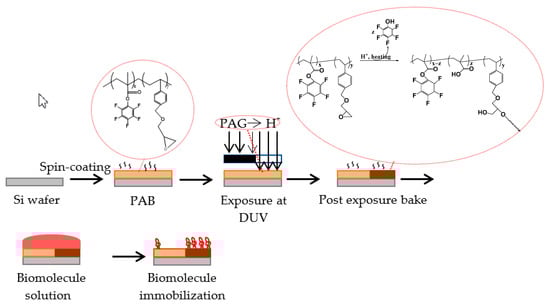 A schematic presentation of the procedure followed to prepare the substrates is provided in Figure 3. Initially, the polymers resist formulations were spin-coated on Si wafers. Then, the films were post applied baked (PAB) followed by exposure at 254 nm through a binary mask. During exposure, acid is produced from the photoacid generator, and in the thermal treatment that follows (post exposure bake, PEB), hydrolysis of the ester group and cleavage of pentafluorophenyl group from the polymer chain takes place. Simultaneously, the epoxy rings open and x-link reactions take place [,,]. In this way, the modified substrates have two areas, the unexposed ones that are rich in fluorine-atoms (light brown area in Figure 3) and the exposed x-linked areas possessing hydroxyl and carboxylic acid groups (dark brown area in Figure 3).