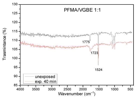 FTIR spectra of the unexposed (black line) and the 40 min exposed to UV area (blue line) of a PFMA/VBGE 1:1 copolymer resist film spin-coated on a Si wafer.
