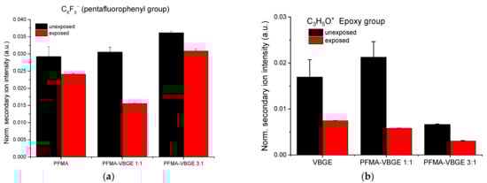 ToF-SIMS analysis was employed to examine the cleavage of the pentafluorophenyl group and the opening of the epoxy group upon exposure of the polymeric films to UV light. For that purpose, the relative intensities of the signals corresponding to two ions were selected: C6F5− that is characteristic of the pentafluorophenyl group of PFMA, and C3H5O+ as the characteristic group of the epoxy ring of VGBE.