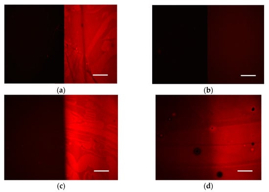 Fluorescence microscope mages received from silicon wafers coated with (a) PFMA homopolymer, (b) VGBE homopolymer, (c) PFMA:VBGE 1:1 copolymer, or (d) PFMA:VBGE 3:1 copolymer after incubation with biotinylated BSA and reaction with AlexaFluor546 labelled streptavidin. In all images, on the left is the unexposed area of the film and on the right is the exposed one. The scale bar corresponds to 50 μm.