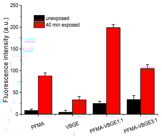 The change in the water contact angle value of the exposed areas vs. the unexposed ones combined with the chemical changes in the surface could result in different behavior regarding their protein binding properties. Therefore, the exposed and unexposed areas of the polymers studied were incubated with a solution of biotinylated BSA and the relative adsorption of the protein to the two areas was estimated by measurement of the fluorescence intensity after reaction with a fluorescently labeled streptavidin. In Figure 6, characteristic fluorescence microscope images obtained from the unexposed and the exposed areas of the polymers, after biotinylated BSA immobilization and incubation with AF546-labeled streptavidin, are provided. The respective fluorescence intensity values are shown in Figure 7. The results show that for all polymers containing PFMA, their protein adsorption capacity increases when exposed to UV irradiation. This can be attributed to the cleavage of the pentafluorophenyl group and its replacement with a carboxylic acid, thus rendering the surface more hydrophilic, and with –COOH groups that facilitate the BSA adsorption mainly through hydrogen bonds and electrostatic interactions.