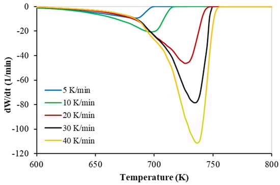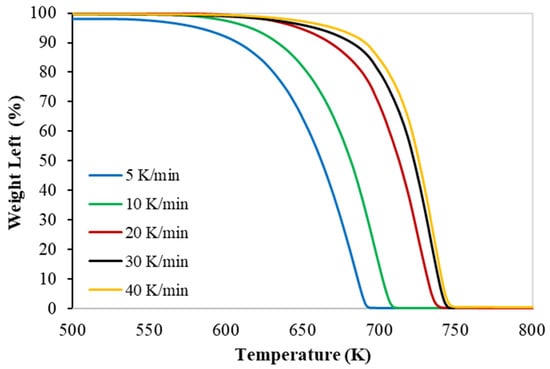 TGA experiments were conducted in nitrogen at 100 (cm3 min−1) with five heating rates, as is shown in Figure 1 and Figure 2, respectively. More details on the TGA brand (PerkinElmer Co., Waltham, MA, USA) and the procedure, including material characteristics such as proximate and ultimate analysis data, are available in my latest publication [].