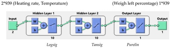 Based on 939 data sets, the feed-forward backpropagation optimization was applied to obtain the output parameter (weight-left %). In this network, only two parameters (heating rate and temperature) were considered input variables, and the weight-left percentage was considered to be the output variable during the non-isothermal experimental run.