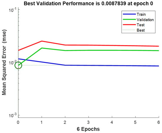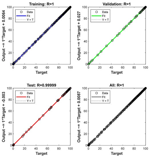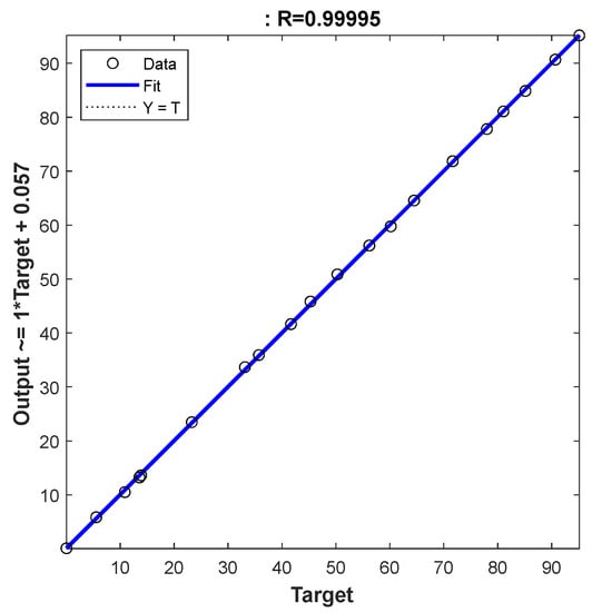 The number of neurons in the hidden layer is an important parameter in deciding the efficiency of the ANN network. To avoid any underfitting (too few neurons) and any overfitting (too many neurons), one should choose the number of neurons in order to achieve a final optimum design (Al-Wahaibi and Mjalli (2014) [], Qinghua et al. (2018) []). Table 1 shows the summary of the final ANN network model. The Levenberg–Marquardt algorithm was considered to be the most-utilized algorithm by previously reported investigators (Beale et al. (2018) []). To verify the applicability of various algorithms, the ANN program was run with more than one algorithm, such as the Scaled Conjugate Gradient and the Bayesian Regularization. By comparing the simulated results, the Levenberg–Marquardt algorithm was identified as the most applicable algorithm. Muravyev et al. (2021) [] mentioned that there are some modern algorithms, such as the “Stochastic Gradient Descent” or “Adaptive Moment Estimation” algorithms, but most of the ANN applications are still limited to “Levenberg–Marquardt” or “Error Backpropagation” algorithms. Figure 4 confirms the results, which are close to the diagonal, indicating a good agreement between the experimental values on the X-axis and the ANN prediction values on the Y-axis at a minimum mean square error (MSE) value of 0.0087839 for the validation stage (Figure 5).