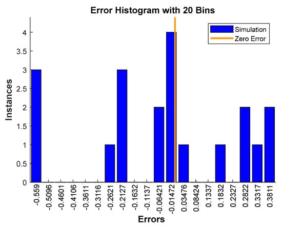 After obtaining the best ANN network with these 939 data, the final and best architecture (Figure 3) was simulated with twenty input data, using four for each heating rate (Table 3). In this simulation stage, fresh input data will be submitted to the network and the ANN network will provide a new, simulated output based on the approved architecture ANN (Figure 6). Figure 6, like Figure 4, shows how close the simulated ANN is to the measured output, confirming the good performance of the network. In addition, Table 4 lists the statistical parameters and shows a slightly high R value (>0.9900) but a very low MBE RMSE and MAE, respectively. Finally, Figure 7 shows the error histogram for the simulation set, which is drawn across the zero error. The error lies in a small range (−0.599 to 0.3811), which indicates the very good performance of the proposed ANN model.