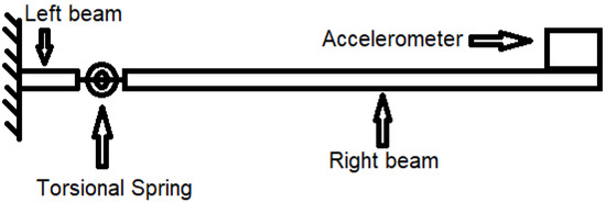 The equivalent torsional spring stiffness was calculated by solving the determinant in Equation (3), where . It was derived from the governing equation of motion for the beam–spring–beam system. Our previous study [13] considered the accelerometer’s mass at the beam end and introduced it into Equation (3), where is the fundamental angular frequency, kg/m3 is the density of ABS, denotes the beam’s cross-section area, is the tensile modulus of ABS, denotes the beam’s moment of inertia, equals the distance between the crack location and beam’s fixed end and represents the specimen length.