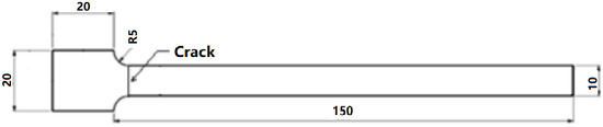 The cracked cantilever beam was used as a base in the research due to its easy-to-observe vibration behaviour, which was consistent with our previous studies [13]. The geometry of the specimen is shown in Figure 2. It was 150 mm in length, 10 mm in width with 3 mm in thickness. The crack width was 0.6 mm. In subsequent experiments, there was a 20 mm × 20 mm square at the fixed end for fixing the beam. The default constant distance from the fixed end to the crack was set as 5 mm, which can significantly differentiate dynamic responses between different crack settings.