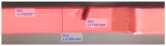 The experimental procedures were divided into four stages, as shown in Figure 4. In the first stage, the dimensions of the artificial crack were measured by a visual approach. A Dino-Lite digital microscope captured the details of the crack. The crack length and inclined angle were measured in DinoCapture 2.0, as shown in Figure 5. Next, the impact test was carried out three times for each specimen to measure the fundamental frequencies and calculate the average value. The obtained mean fundamental frequency was then fed to the signal generator. It drove the shaker to vibrate sinusoidally with a 1 mm amplitude. This frequency excited the beam specimen to resonance. The accelerometer recorded the acceleration amplitude and corresponding time for the following data processing.