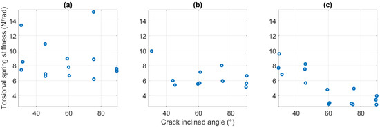 The p-value 0.0695 provided by correlation analysis (Table 2) appeared to suggest no significant influence of the crack angles on the spring stiffness. However, the corresponding r value −0.2731 and Figure 7 demonstrated that the increased inclined angle resulted in lower spring stiffness. Furthermore, compared to Figure 7a,b, Figure 7c showed a more significantly reduced trend from around 8 N/rad of 30° inclined angle to 3.5 N/rad of 90° inclined angle, which attained a reduction in stiffness of over 50%.
