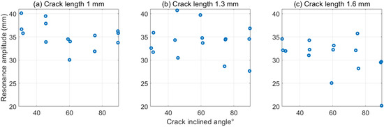 First-order resonance amplitude for inclined cracks with different angles. (a) 1 mm crack length. (b) 1.3 mm crack length. (c) 1.6 mm crack length.
