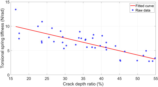 Therefore, a regression model between the crack depth ratio and equivalent torsional spring stiffness was developed, as shown in Equation (7) and Figure 10, with a 62.76% R-square value.