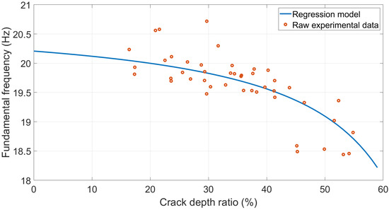 The modelled stiffness was then substituted into the determinant in Equation (3) to calculate the modelled fundamental frequency for validation. The results are shown in Figure 11. The experimental fundamental frequency data points were distributed along the regression curve. The maximum difference between the raw data and the regression model was around 4.3%, which was acceptable.