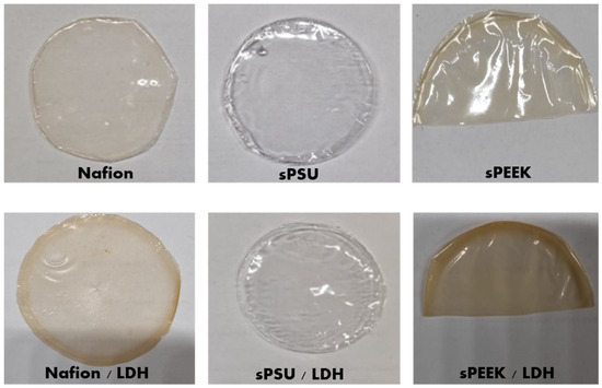 Pictures of Nafion, sPSU, and sPEEk-LDH composites (at 3% of filler loading) membranes.