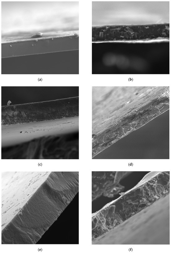 Cross-sectional SEM images of (a) Nafion, (b) Nafion/LDH, (c) sPEEK, (d) sPEEK/LDH, (e) sPSU, and (f) sPSU/LDH membranes.