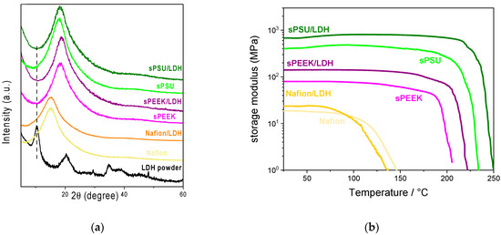 (a) XRD patterns and (b) DMA thermograms for the Nafion-based, sPEEK-based, and sPSU-based membranes.