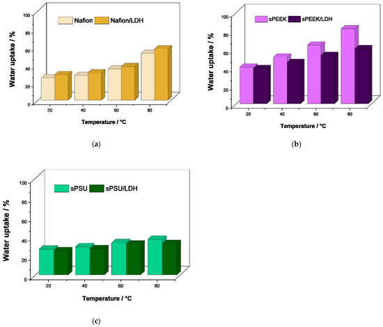 To clarify the effect of the LDH introduction on the hydrolytic resistance of the various nanocomposite membranes, their swelling behavior was investigated under variable temperatures. In this regard, Figure 4 shows the temperature evolution of the water uptake for the Nafion-based (Figure 3a), sPEEK-based (Figure 4b), and sPSU-based (Figure 4c) membranes, in the temperature range 20–80 °C. Both Nafion and sPEEK membranes exhibit a massive swelling during heating, with an increase of more than 50% in the water uptake at 80 °C. This is predictive of low dimensional stability which typically leads to deterioration of mechanical resistance and, most importantly, to dimensional mismatch when the membrane is assembled into a fuel cell [68]. Obviously, the highest swelling is reached by bare sPEEK due to the very high IEC value. In the case of bare sPSU, the swelling tests revealed the membrane has an excellent anti-swelling capability: its water uptake increases from ca. 27 wt.% at 20 °C to 37 wt.% at 80 °C. Turning the attention to the nanocomposite membranes, it can be clearly seen that the introduction of the LDH poorly impacts the swelling features of Nafion. De facto, the filler particles simply increase the number of hydrophilic sites in the PEM. On the other side, the anionic clays have a beneficial impact on the dimensional stability of both sPEEK and sPSU due to the massive reduction in swelling during heating. Such an outcome is very positive because it guarantees the dimensional stability of the electrolyte membrane during the PEMFC operation.