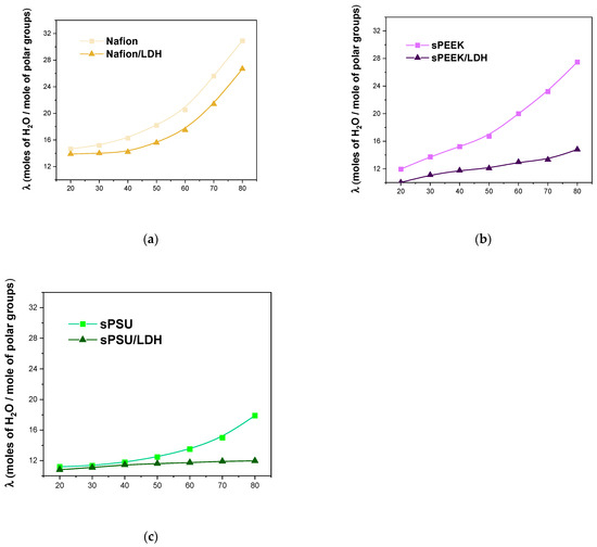 This is further corroborated by the temperature evolution of the lambda (λ) or coordination number, described as the number of water molecules per sulfonic acid group. The λ values provide crucial information concerning the microstructure of the electrolyte films. The values for the investigated membranes, for the temperature range 20–80 °C, are illustrated in Figure 5. The λ value increases (massively for Nafion and sPEEK whereas moderately for sPSU) with the temperature due to the softening of the polymer chains under the thermal energy, which can thus accommodate a larger amount of water. It is worth noting that, for all the hosting matrices, the λ value declined remarkably after the addition of LDH. As discussed above, the nanocomposite membranes exhibit higher IEC but similar water uptake compared to the parental polymers. This means in the membranes containing the LDH nanoplatelets there is a larger number of hydrophilic groups but a lower number of water molecules solvating them. Moreover, while the addition of LDH particles inside the Nafion matrix does not impact the dimensional variation of the ionic clusters with the temperature, the number of water molecules per sulfonic acid group barely increased during heating for both sPEEK and sPSU nanocomposites. This definitely confirms that in these polymers the introduction of the LDH minimizes the alteration of the cluster size during heating due to the aforementioned crosslinking activity of the LDH lamellae.