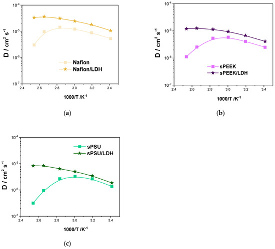 Self-diffusion coefficients and as a function of the temperature (from 20 °C to 120 °C) of the water confined in (a) Nafion and Nafion/LDH, (b) sPEEK and sPEEK/LDH and (c) sPSU and sPSU/LDH.