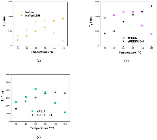 The analysis of spin-lattice relaxation times (T1) was able to shed light on molecular interactions of water molecules inside the investigated membranes. Compared to D, T1 refers to more localized motions including both translation and rotation on a time scale comparable to the reciprocal of the NMR angular frequency (a few nanoseconds). In a nutshell, the larger the interactions between spin and lattice, the quicker the relaxation (shorter T1), with T1 generally increasing with the temperature [69]. Figure 7 reports the temperature behavior of T1 in the range of 20–120 °C. We can observe that T1 values decrease for all the polymer matrices after the addition of the LDH lamellae, confirming the filler provides for stronger dipolar interactions, and faster decays of longitudinal magnetization (shorter T1), with the water molecules. Since the Grotthuss mechanism relies on the creation of a highly-interconnected path for ion transport, stronger interactions between the H+ ions and the lattice generally provides for higher proton conductivity [70].