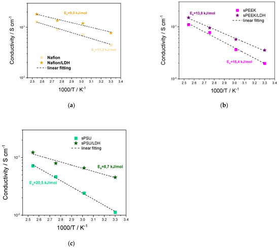 Arrhenius plots of proton conductivities at 90% RH of (a) Nafion and Nafion/LDH, (b) sPEEK and sPEEK/LDH and (c) sPSU and sPSU/LDH. Dash lines represent the linear fitting to experimental data.