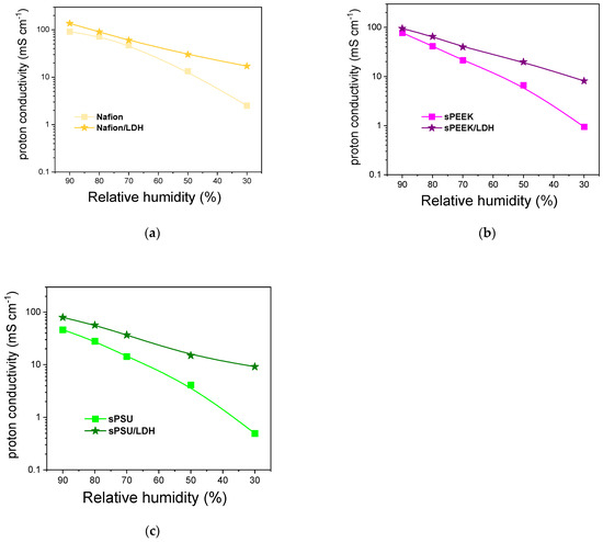 Proton conductivity vs. relative humidity at 90 °C for (a) Nafion and Nafion/LDH, (b) sPEEK and sPEEK/LDH, and (c) sPSU and sPSU/LDH membranes.
