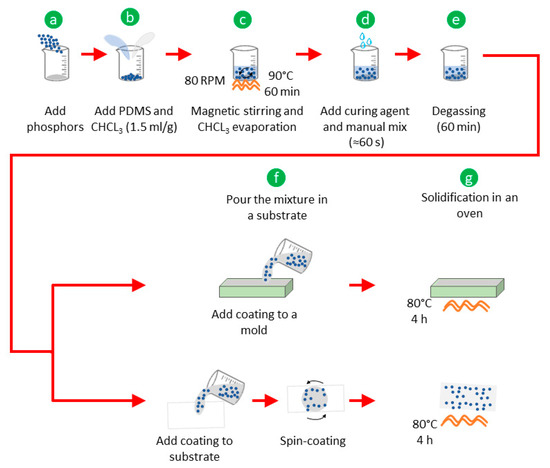 Mixing methodology to obtain the fluorescent polymer composites (PDMS-phosphor; see text for further details).