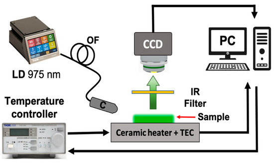 Schematic representation of the experimental setup used to analyze the fluorescence from the PDMS-YbEr membranes as a function of temperature: light from a laser diode (LD) coupled to an optical fiber (OF) is collimated (C) and used to irradiate the sample. The fluorescence from the membrane is captured by a CCD camera after filtering the residual IR radiation. Temperature adjustments are made by a TEC controller connected to a personal computer (PC), which is also for image acquisition.