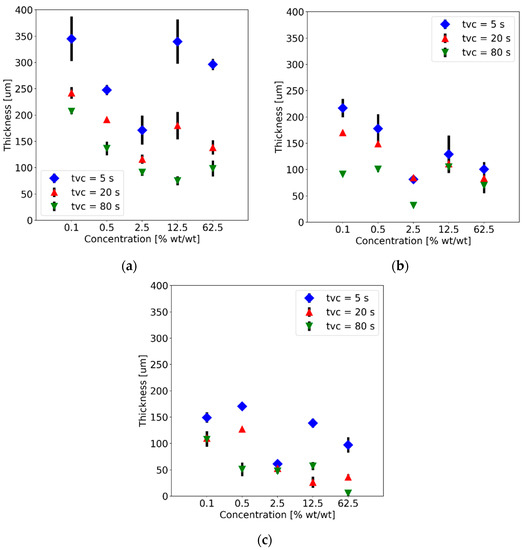Membrane thicknesses obtained for membranes fabricated with different concentrations of PDMS-GOS:Eu powder. Results are presented for three different spin-coating velocities ((a) 1000 rpm, (b) 2000 rpm and (c) 4000 rpm) and for the indicated spinning times (tvc).